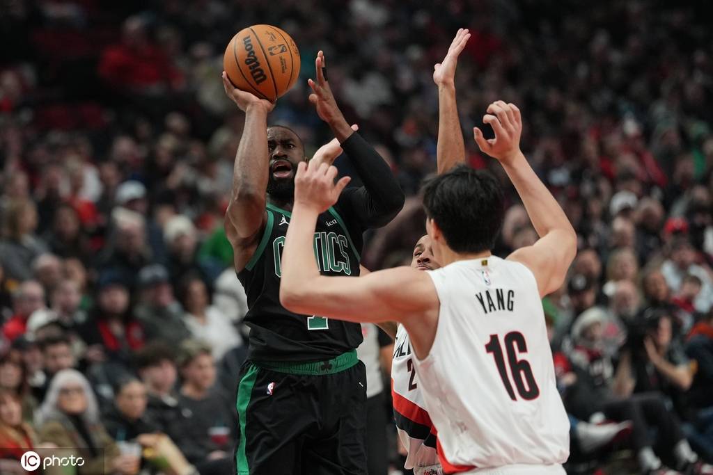 组图:NBA-开拓者擒绿军 杨瀚森轰三分后庆祝